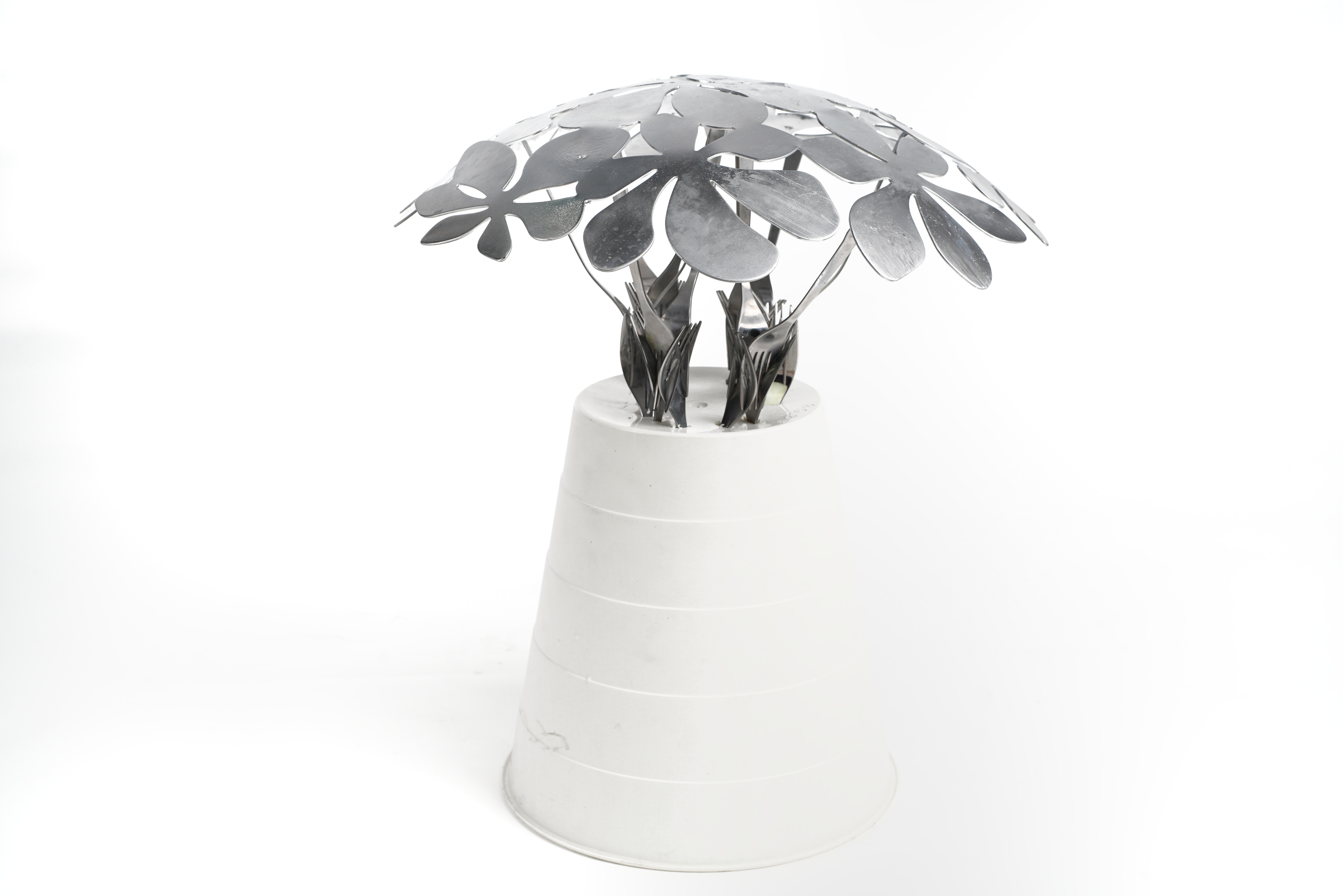 我所设计的由不锈钢果盘作为凳面,不锈钢叉子插接作为支撑的凳子是尖锐的、冷硬的,与人们常规认识的凳子截然相反。同时,通过叉子之间连接作为凳子的支撑结构挑战了该不锈钢材料的韧性与硬度。整个凳子由聚丙烯塑料和不锈钢材料组成,简单淳朴。